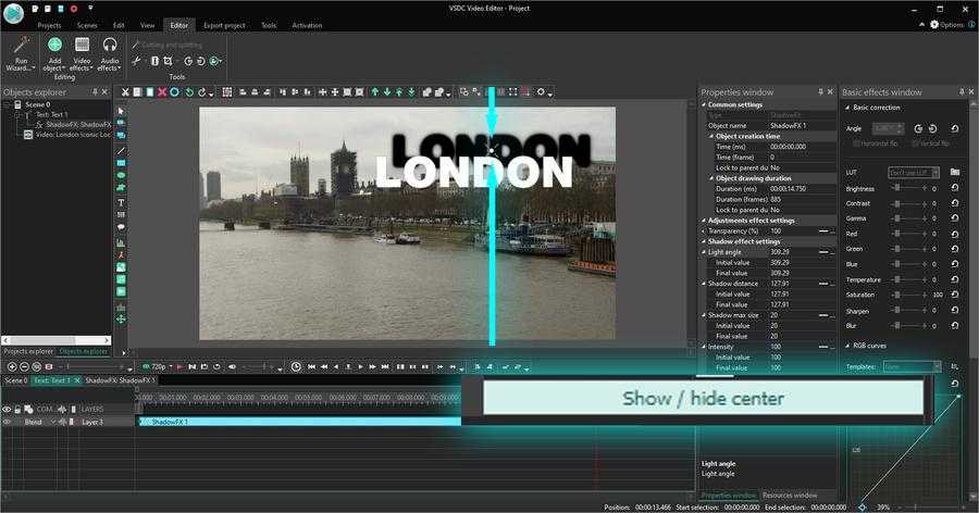 Совет. Для настройки угла и расстояния вы можете вручную перемещать тень на сцене, захватив её мышью в центре. Если вы не можете найти центр, используйте кнопку «Показать/скрыть центр» в окне свойств.