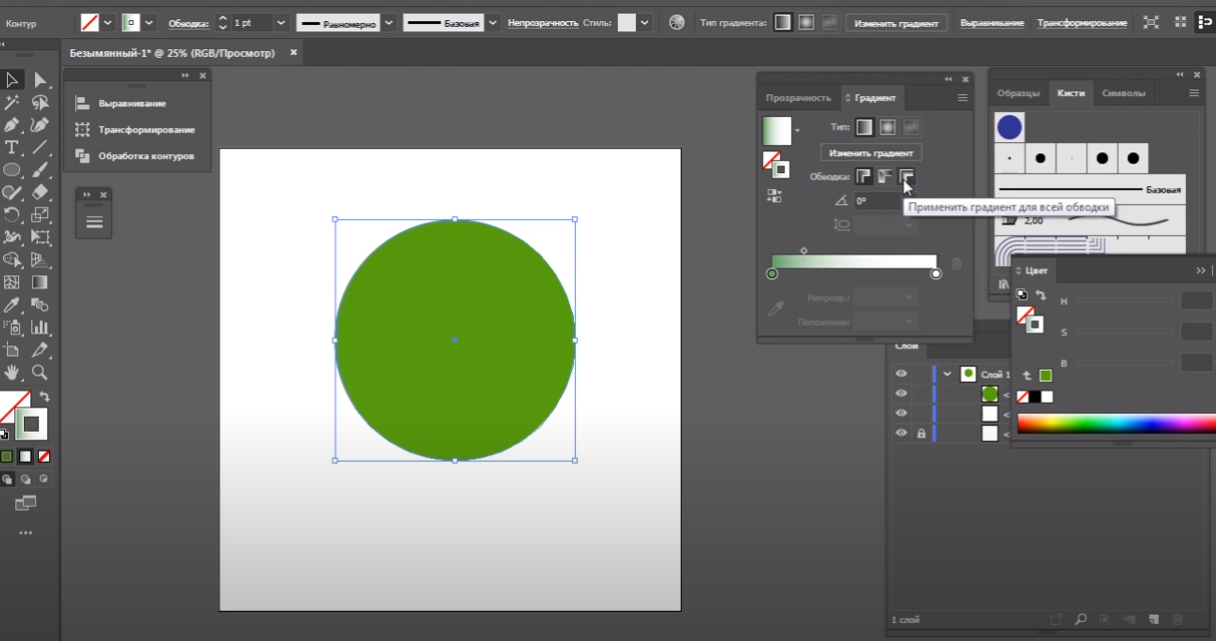 Выберите линейный градиент, а также функцию «применить градиент для всей обводки».