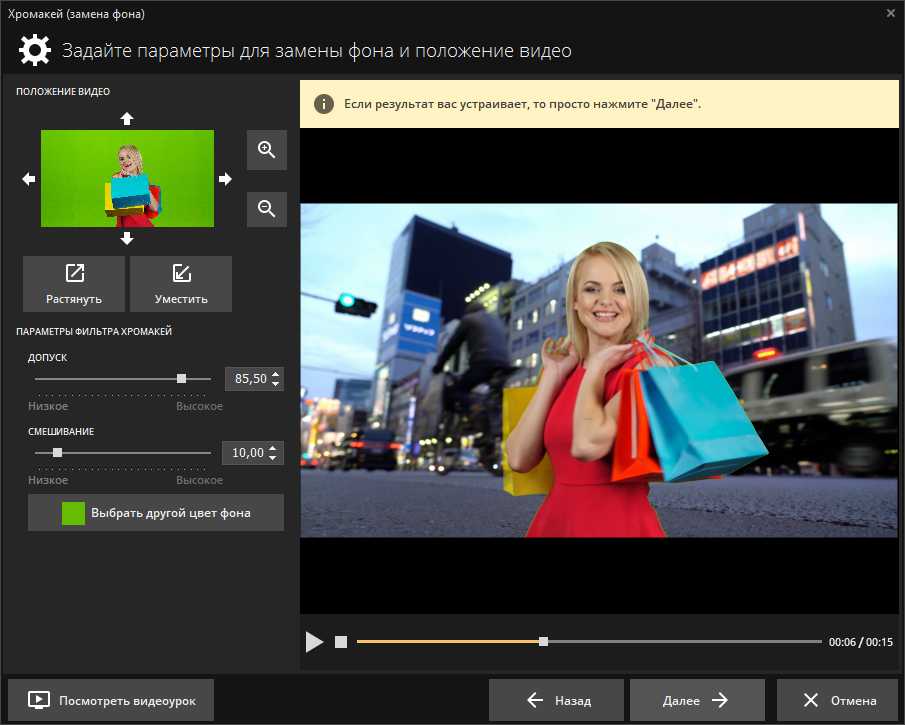 Алгоритм действий:1. Откройте в приложении сначала фоновый видеоряд. Видео с объектом переднего плана добавляется потом.2. Кликните по значку наложения (вставки) в правой части экрана.3. Выберите объект с хромакеем и добавьте его.4. Нажмите на значок с хромакеем и определите цвет, который требуется удалить.5. Если удаление прошло некачественно, настройте силу цветового ключа.6. Сохраните созданный видеоролик.