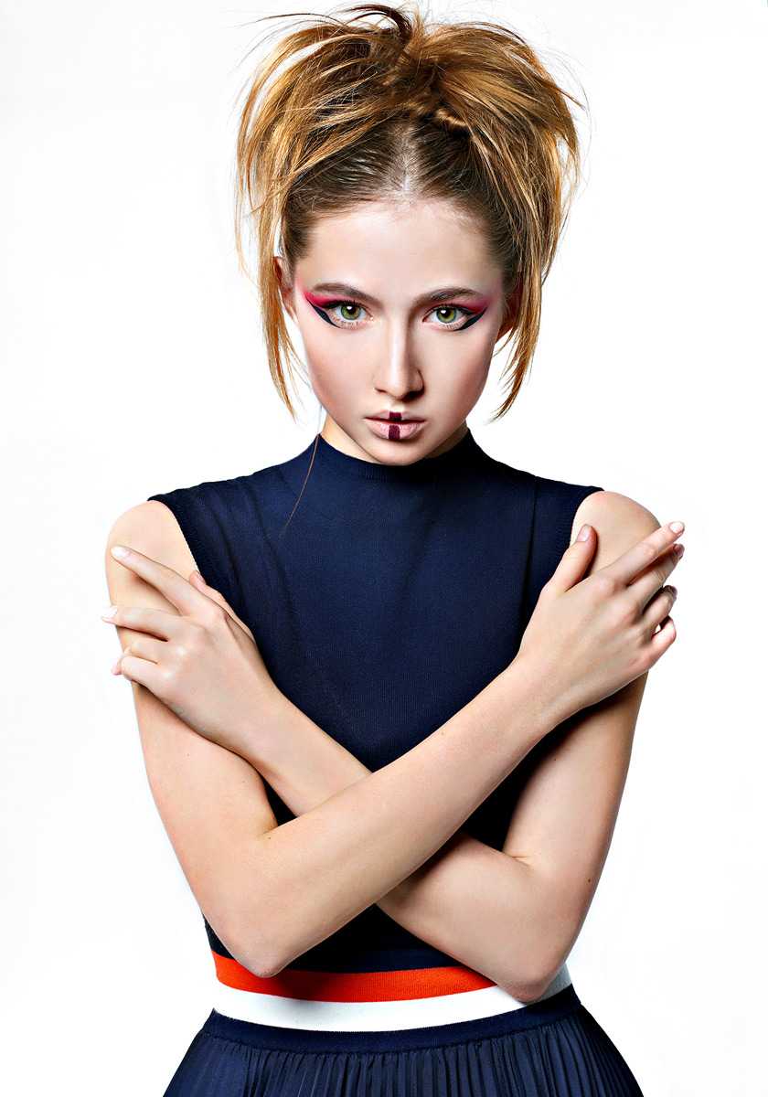 Источники света находится в 3 четвертях: универсальное расположение рисующего света подходит для различных типов лиц. Минимальная освещенность визуально сужает лицо. Это приемлемое световое решение, даже если модель поворачивает голову во время сьемки в сторону.